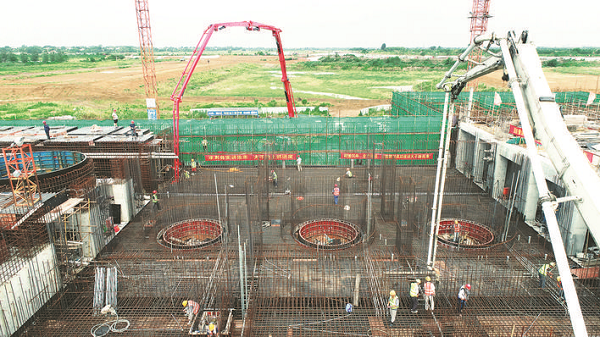 8月12日,在肥西縣嚴(yán)店鄉(xiāng)引江濟(jì)淮派河口泵站施工現(xiàn)場(chǎng),工人們正在澆筑泵站第二聯(lián)出水流道混凝土。隨著第一車混凝土的順利入倉(cāng),標(biāo)志著該重點(diǎn)工程項(xiàng)目在停工近一個(gè)月后正式全面復(fù)工。據(jù)悉,引江濟(jì)淮派河口泵站工程位于派河下游的蓮花圩內(nèi),受今年汛情影響,工程在7月19日暫時(shí)停工。為了保護(hù)安徽省一號(hào)工程不受洪水威脅,當(dāng)?shù)馗扇汉腿嗣褡拥鼙岆U(xiǎn),對(duì)派河大堤進(jìn)行了緊急除險(xiǎn)加固,保住了大堤,為項(xiàng)目復(fù)工贏得了時(shí)間。