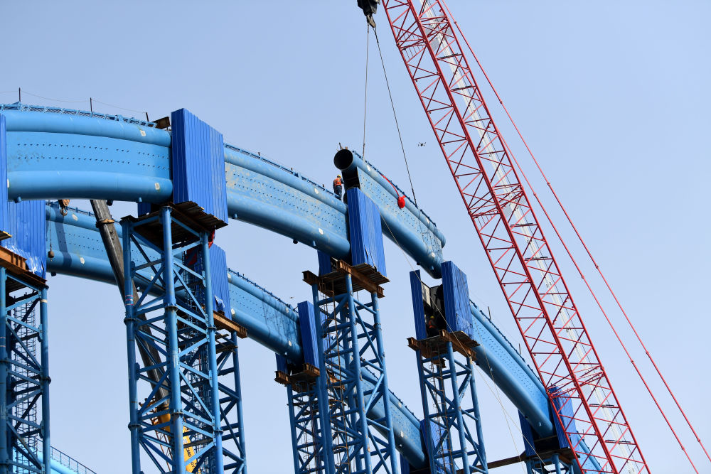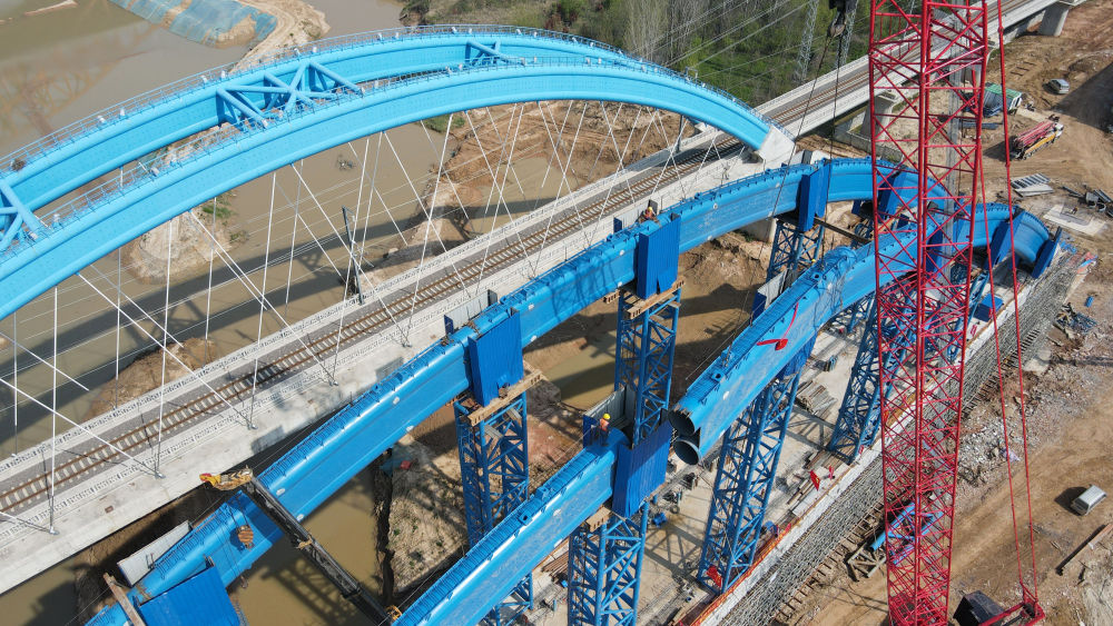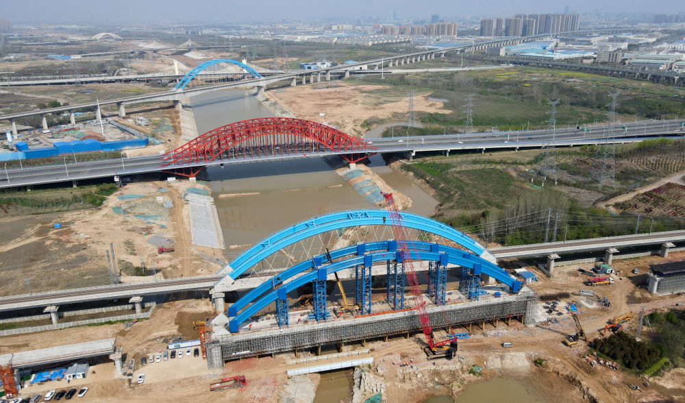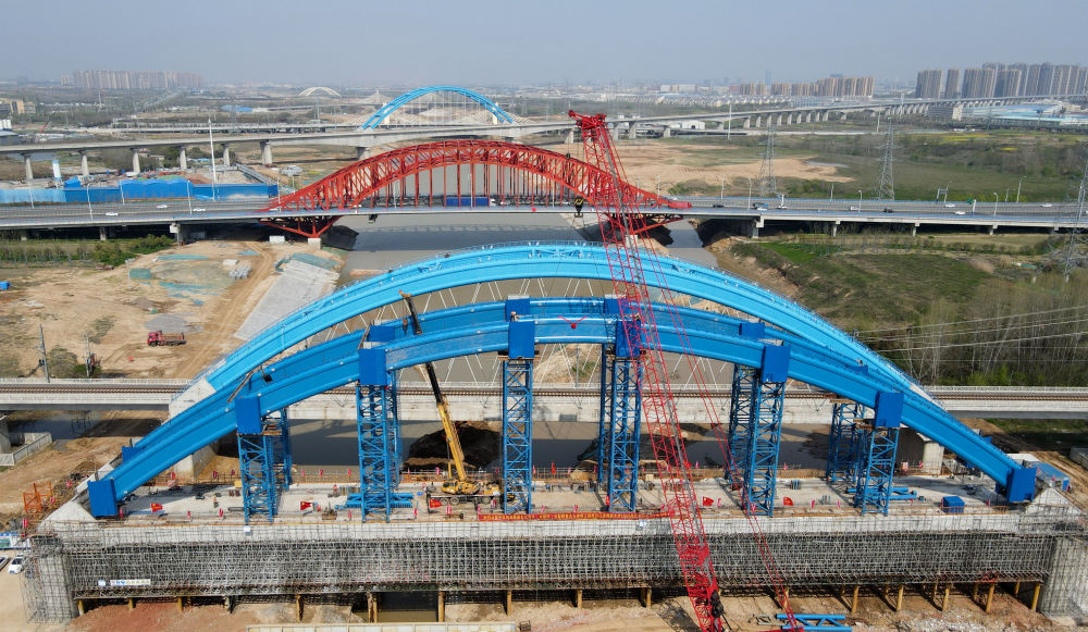 ↑這是中鐵四局引江濟(jì)淮合九鐵路改建工程特大橋系桿拱合龍施工現(xiàn)場(4月2日攝)。新華社記者 劉軍喜 攝影報(bào)道