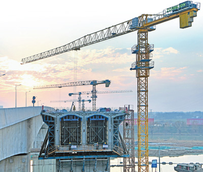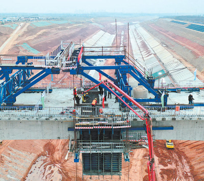 引江濟(jì)淮工程安徽段東津渡大橋左幅橋梁施工現(xiàn)場(chǎng)。