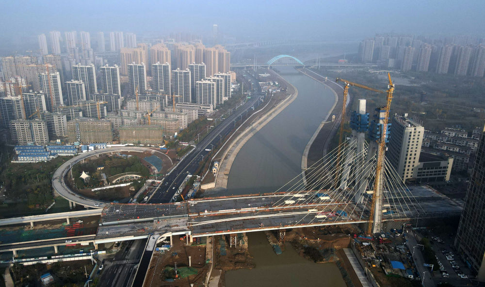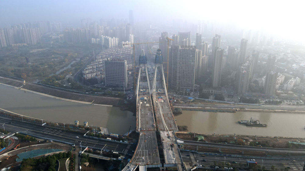 ↑這是正在進行主塔封頂施工的引江濟淮金寨南路橋(11月24日攝,無人機照片)。