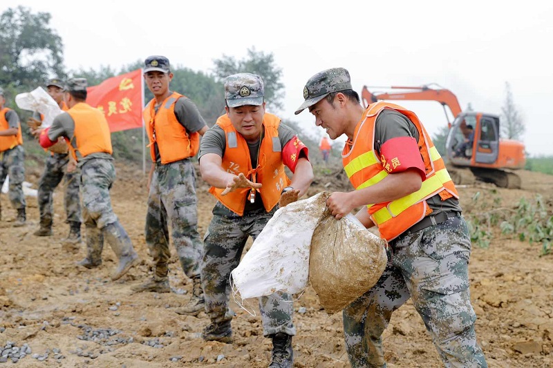 嚴(yán)店鄉(xiāng)蓮花圩派河大堤上,官兵奮戰(zhàn)在抗洪搶險一線。