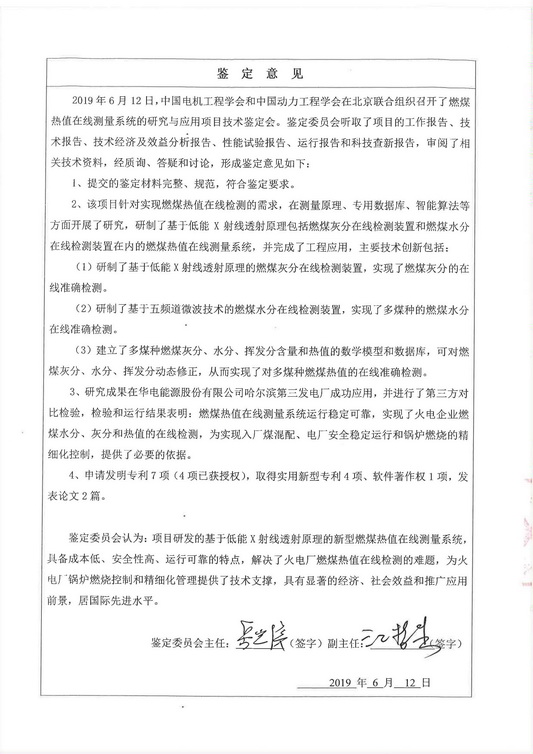 鑒定委員會(huì)認(rèn)為:項(xiàng)目研發(fā)的基于低能X射線透射原理的新型燃煤熱值在線測量系統(tǒng),具備成本低、安全性高、運(yùn)行可靠的特點(diǎn),解決了火電廠燃煤熱值在線檢測的難題,為火電廠鍋爐燃燒控制和精細(xì)化管理提供了技術(shù)支撐,具有顯著的經(jīng)濟(jì)、社會(huì)效益和推廣應(yīng)用前景,居國際先進(jìn)水平。